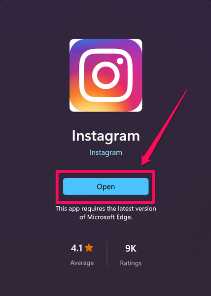 1.安装 Instagram 应用程序后,您可以使用以下命令打开它:打开Microsoft Store 上的按钮或在“开始”菜单中找到它并左键单击它。
