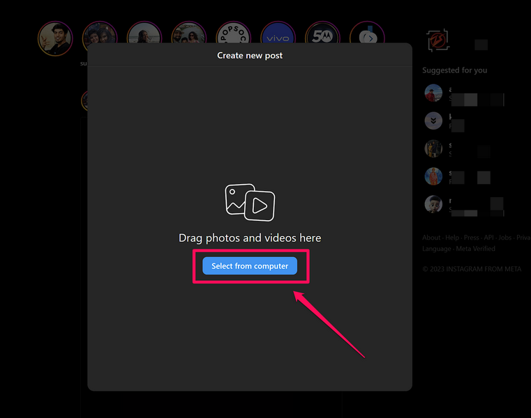 2.现在,在出现以下提示时,您可以单击从计算机中选择按钮可浏览 PC 或笔记本电脑上存储的图像和视频,然后选择要共享的图像和视频。或者,您可以简单地拖放媒体内容您想要在“创建新帖子”提示中发布的内容。
