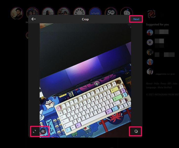 3.添加图像或视频后,应用程序将在编辑器中将其打开。通过编辑器,您可以设置您喜欢的宽高比,调整缩放和裁剪的图像,并且还添加额外的图像/视频到 Instagram 帖子。