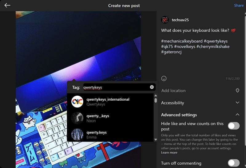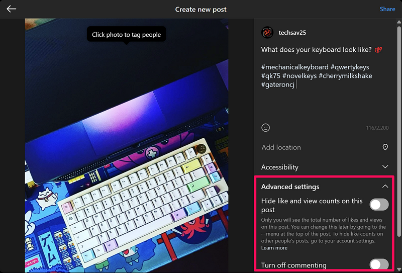 8.不仅如此,你还可以调整一些高级设置例如打开/关闭评论以及隐藏/取消隐藏帖子的点赞和查看计数。