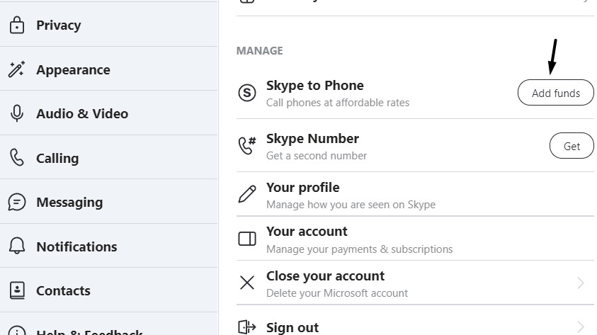 1.移至设置你的Skype应用程序然后单击添加资金旁边Skype 至电话.