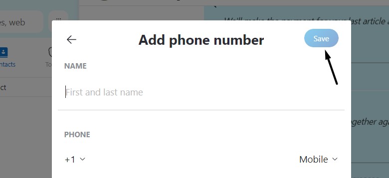 2.在搜索中键入全名、电子邮件地址或号码以在 Skype 上搜索人员。如果您找不到使用该姓名的人,请单击添加电话号码按钮。在字段中输入名字和姓氏姓名框中和联系电话数字盒子。