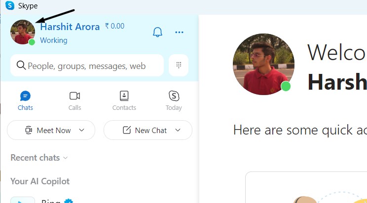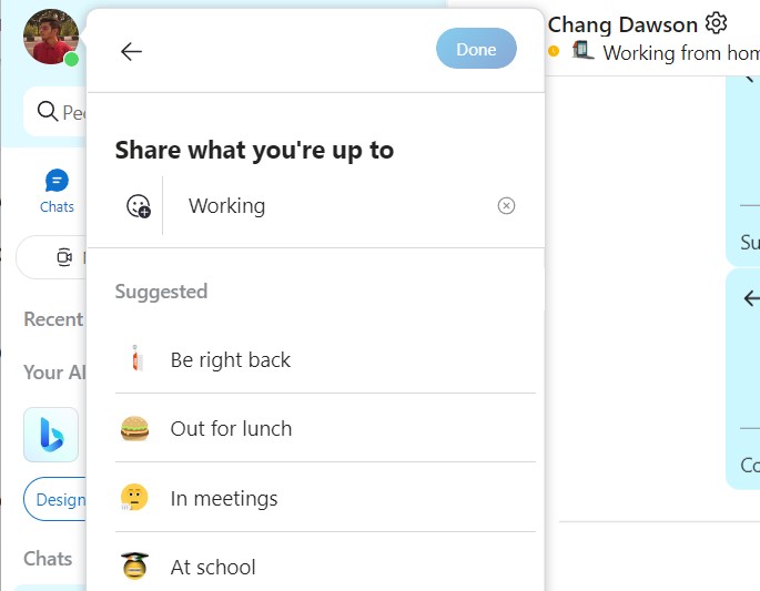 与 WhatsApp 类似,Skype 也可以让您分享您的状态与您的联系人。例如,您分享您目前在做什么。除此之外,您还可以将 Skype 配置文件设置为“活动”、“离开”和“请勿打扰”。您可以按照以下步骤学习如何执行此操作: