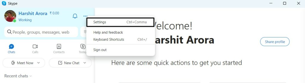 1.单击三点 (...)并选择 Skype 窗口顶部的设置从下拉菜单中。