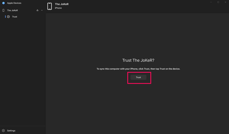 5.当你连接你的 iPhone 时,你会得到一个信任提示在 Apple 设备应用程序以及您的 iOS 设备上。