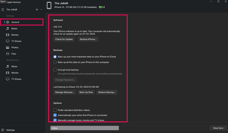 9.默认情况下,Apple 设备应用程序应打开一般的您的 iPhone 页面。在这里,你可以检查 iOS 更新为您的 iPhone,恢复设备,创建/管理/恢复备份,并访问各种其他选项。
