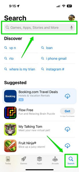 2. 转到“搜索”选项卡在底部导航栏上和使用搜索栏到找到 Arc Search 浏览器.
