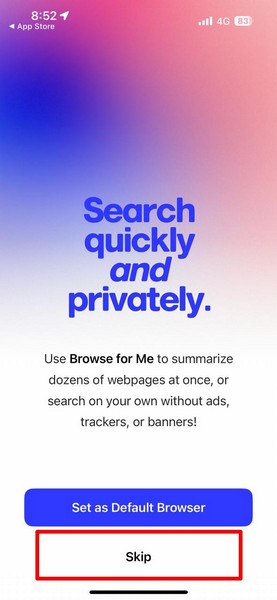 在下一页上,浏览器将提供将其设置为 iPhone 上的默认 Web 浏览器的选项。在这个演示中,我们会跳过它因为我们已经有专门的文章了。因此,点击跳过按钮。