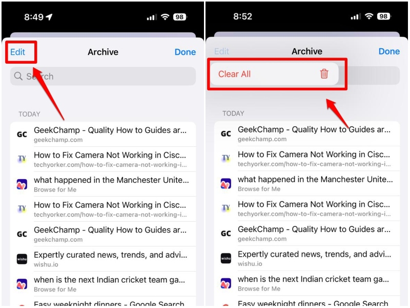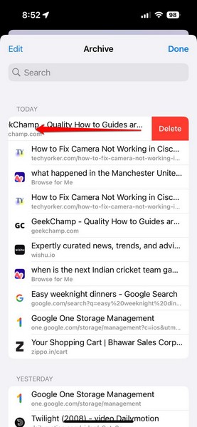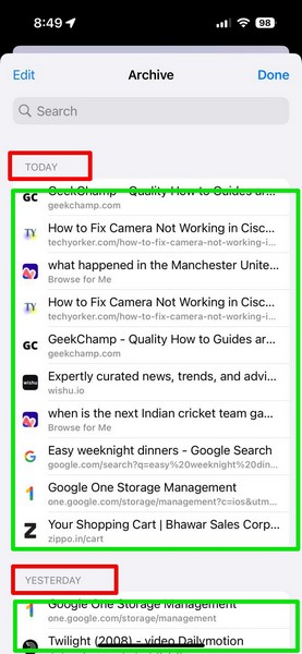8.在这里,您可以查看您之前打开的所有网页,搜索查询, 和“为我浏览”页面列出在今天,昨天, 和3 天前部分。您还可以使用上面的搜索栏到查找特定结果在档案馆中。