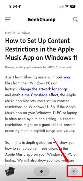 12.现在,在网页上时,您可以点击 ^(向上箭头)按钮在底部导航栏上访问搜索栏和其他选项.