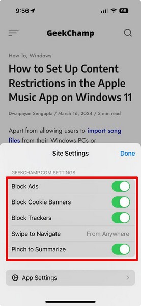 14.此外,您还可以点击站点设置选项到启用或禁用特定于站点的功能例如广告拦截、cookie 拦截、跟踪器拦截等。