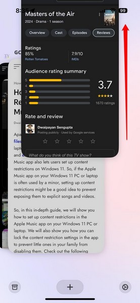 6.就像从 iOS 多任务窗格中向上滑动应用程序以强制关闭它们一样,您可以向上滑动单个或多个选项卡以关闭它们在 iPhone 上的 Arc Search 浏览器中。
