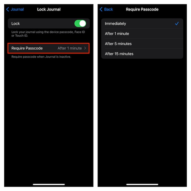 如果您希望 Face ID 在关闭日记应用程序后立即锁定它,请选择“立即”选项。由于此安全功能立即生效,您不再需要担心私人日记的保护。