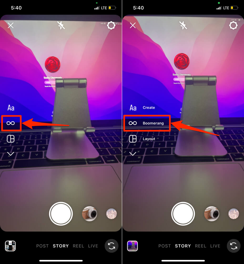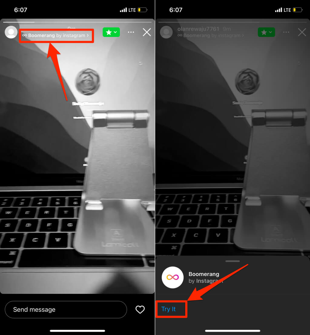 您的关注者或亲密朋友在查看故事时会看到“Boomerang”标签。他们可以点击标签并选择尝试一下在他们的设备上创建一个 Boomerang。在人们的 Instagram 故事中查看 Boomerangs 时,您也可以执行相同的操作。点击故事上的 Boomerang 标签并选择尝试一下。
