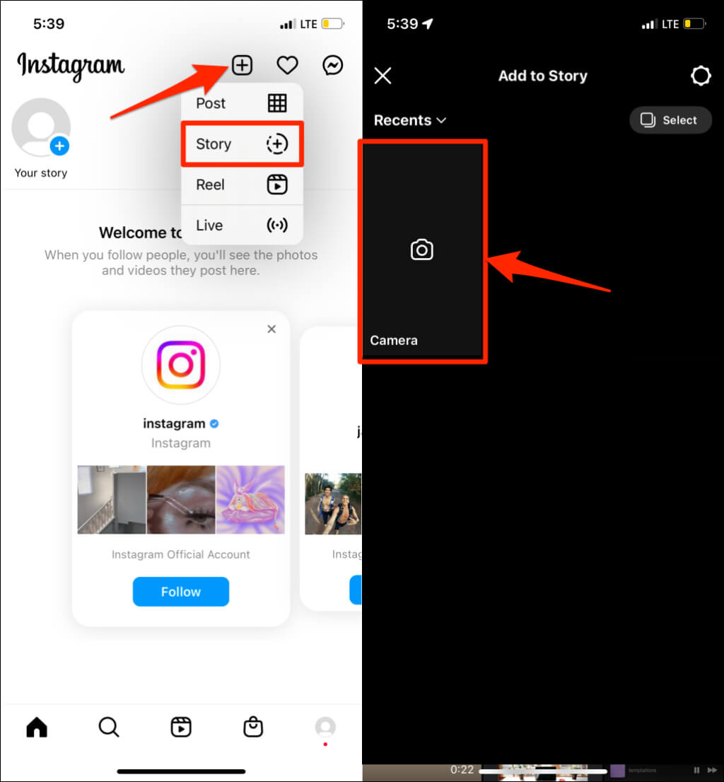 - 打开 Instagram,点击加号图标,然后选择故事。