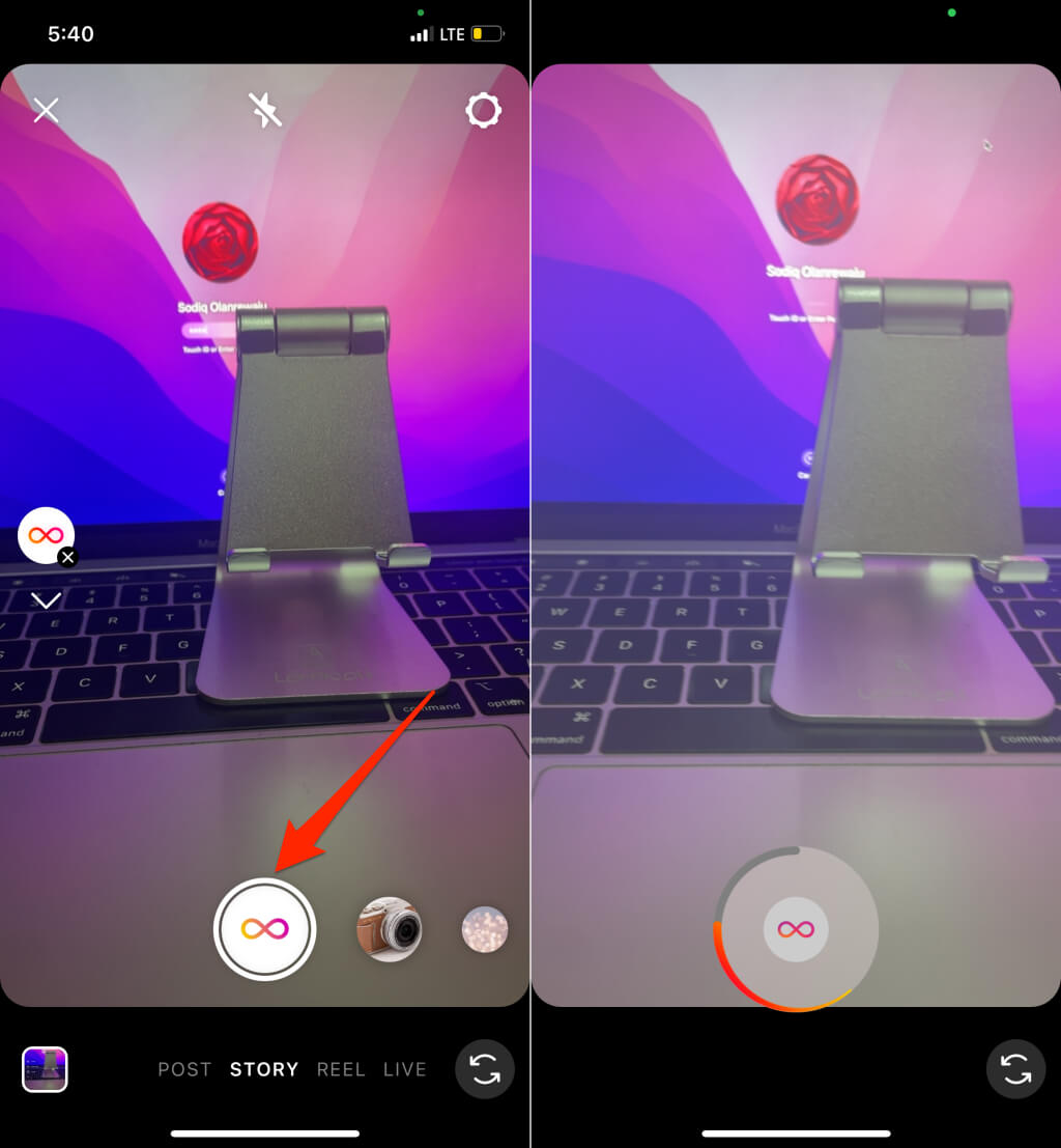 - 录制按钮变为 Boomerang 图标。点击录音按钮并捕捉您想要制作回旋镖的主题或风景。