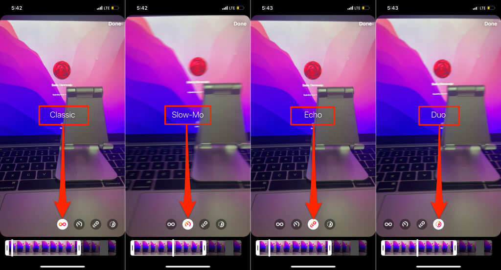 Instagram 有四种 Boomerang 故事模式:经典的,慢动作,回声, 和双人组。 “Classic”是默认的 Boomerang 模式,而“Slowmo”则为录制的剪辑添加慢动作效果。使用“Echo”,您的 Boomerang 将具有运动模糊效果。 “Duo”以交替的时间间隔加速和减慢回旋镖。