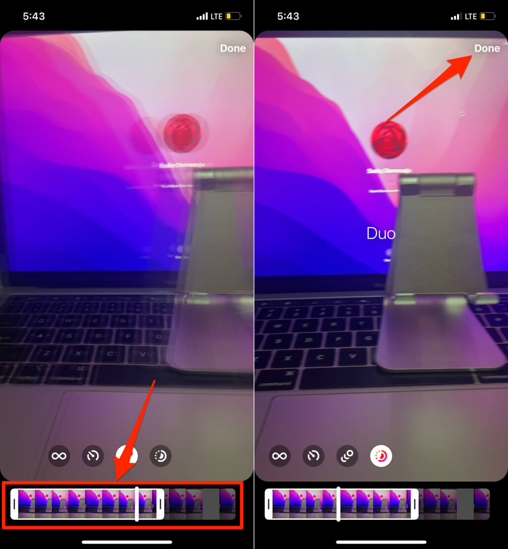 - 有一个修剪模式选择页面底部的工具。从左边缘或右边缘移动工具以裁剪视频的特定部分。轻敲完毕调整视频循环或长度后的右上角。