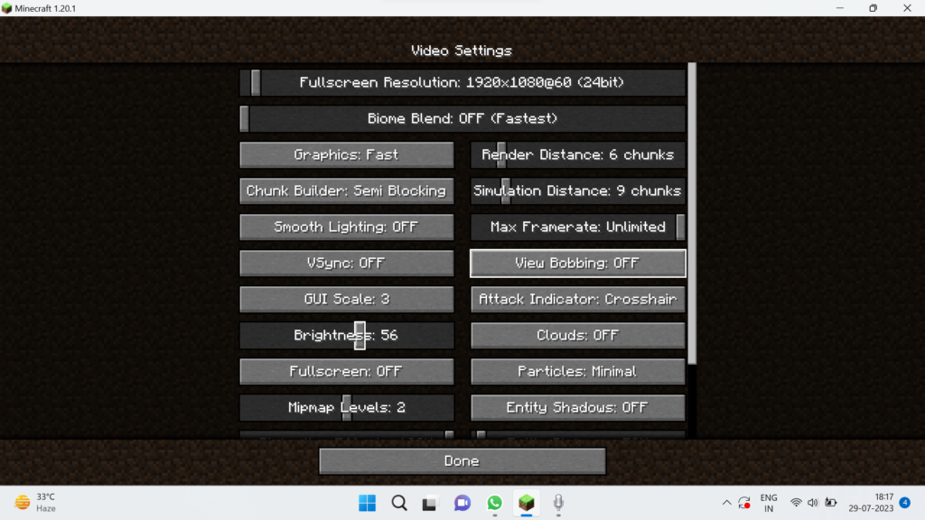 如果您运行最新版本,但 Minecraft 仍然感觉不流畅,那么您应该尝试的下一件事是更改 Minecraft 视频设置。您可以调整某些视频设置,以使 Minecraft 在您的 PC 上运行得更好。请按照以下步骤更改 Minecraft 视频设置: