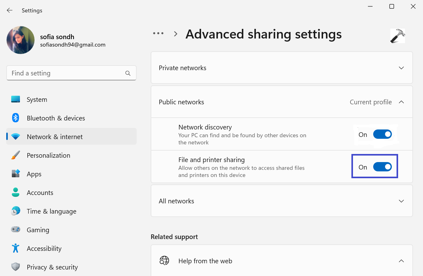 5. 如果您想将文件从计算机共享到网络,则还要选择打开“文件和打印机共享”选项。