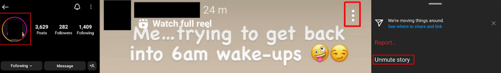 - 点击故事图标在其个人资料的左上角,然后点击三个垂直点故事右上角的菜单,然后选择取消静音故事。