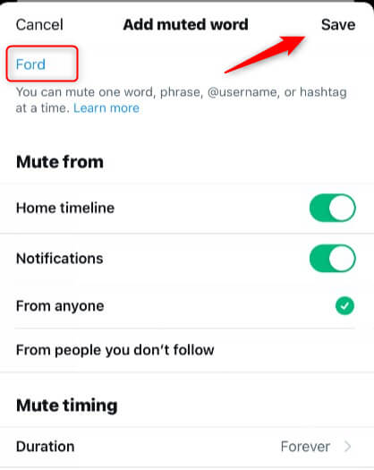 - 您终于可以在屏幕上添加要静音的术语了。点击文本框并一次输入一个术语。您还可以选择将术语静音的位置以及您希望术语静音的持续时间。轻敲节省当你完成时。