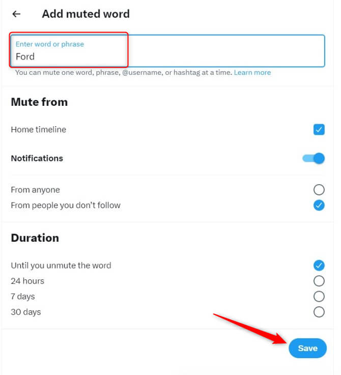 - 您可以在此处添加要静音的术语。您需要单独输入每个条目。在文本框中输入要静音的词语,选择要静音的位置,选择要静音的时长,然后单击节省。