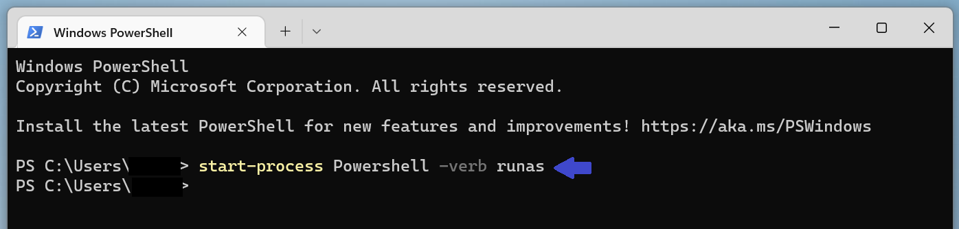 第 2 步:复制此命令“启动进程 Powershell -verb runas”,然后按回车键。