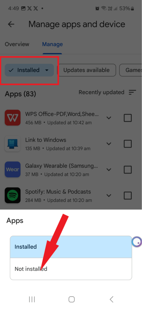 第5步:单击已安装按钮然后选择未安装。这将为您提供您随时从设备中删除或卸载的游戏和应用程序的列表。
