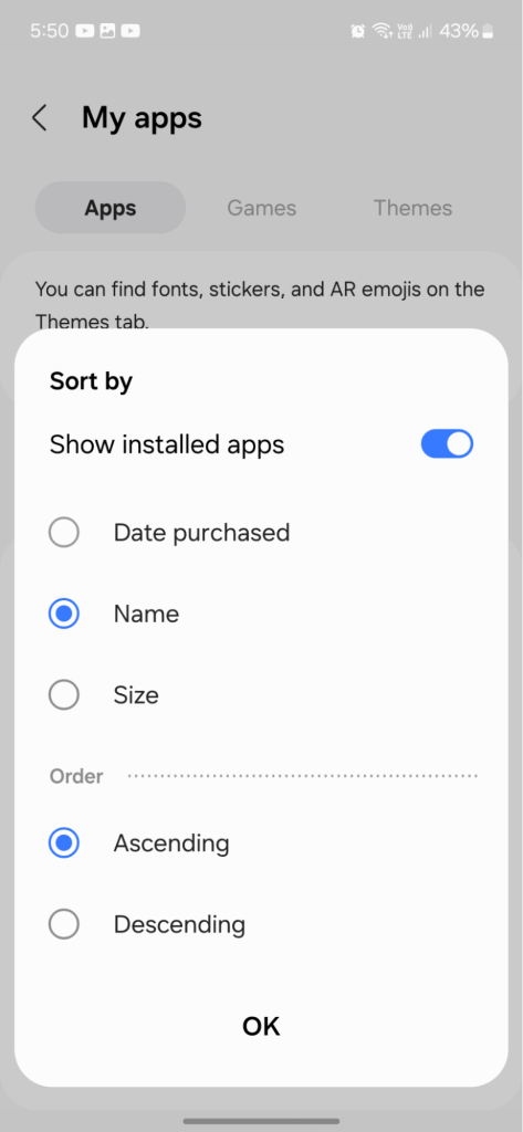 第5步:启用 '显示已安装的应用程序' 通过点击切换开关来选择。从以下选项中选择任意一项:购买日期、名称或尺寸。点击好的。