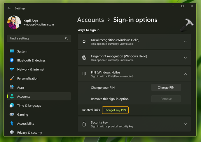 2.在“设置”应用程序中,转到账户>登录选项。在 PIN 下方的相关链接下,单击我忘记了 PIN 码链接在那里。执行此操作时,请确保您的系统已连接到网络,以防您使用微软账户。