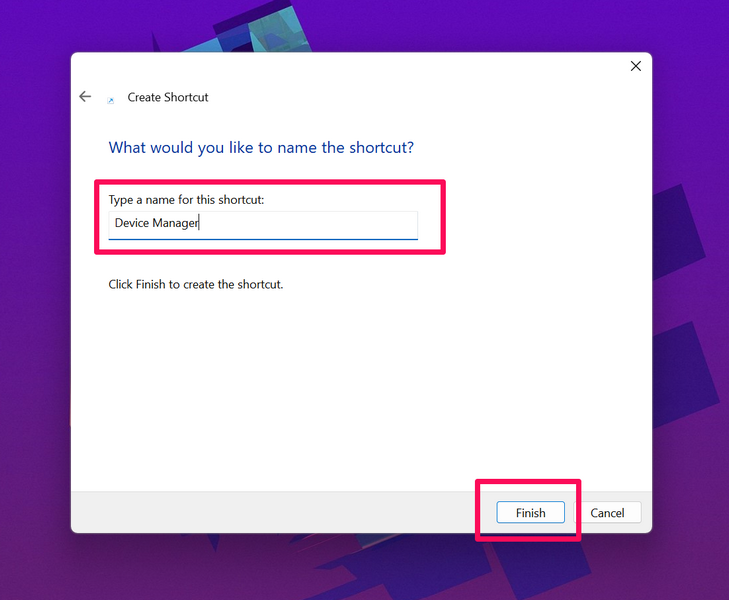 4.在下面的窗口中,提供快捷方式的名称并单击结束按钮。在本例中,我们将其命名为“设备管理器”。