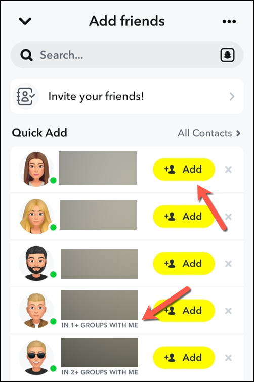 - 看看通过快速添加部分并检查用户名X+共同好友在他们旁边。这些用户与您拥有相同的共同朋友。如果您在共享群聊中,这些用户将收到消息和我一起在 X+ 组中反而。