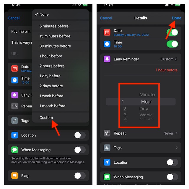 - 在左侧转盘上选择 1 到 200 之间的数字,然后使用右侧转盘在分钟、小时、天、周和月之间进行更改。请注意,这些表盘允许您为 1 分钟到 200 个月之间的任何时间创建早期提醒。