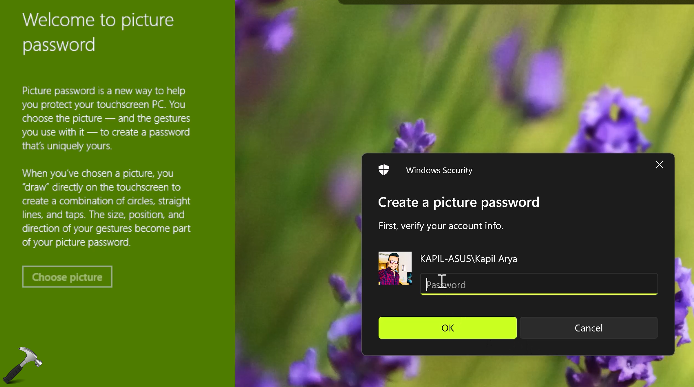 4.现在您将进入图片密码设置向导。首先输入您当前的用户帐户密码以验证您的身份。