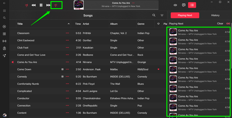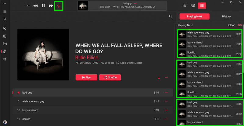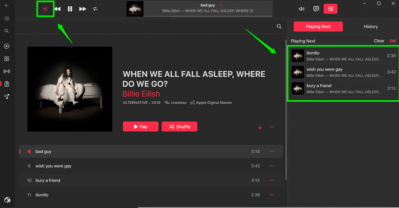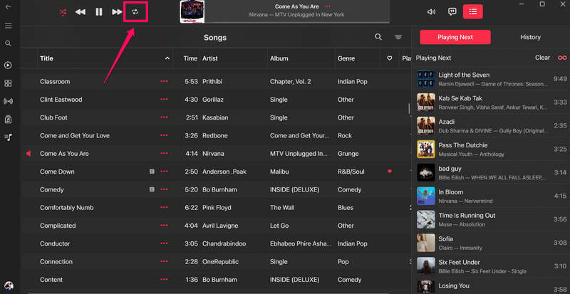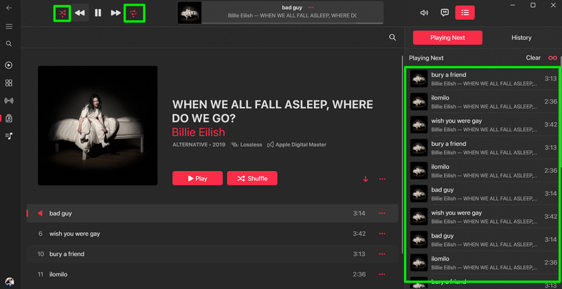 现在,当您从 Apple Music 资料库的“歌曲”部分流式传输歌曲时,“随机播放”和“重复播放”按钮会以特定方式工作。在本节中,我们解释了当您在播放 Apple Music 库中最喜欢的曲目时激活它们时它们的工作原理。