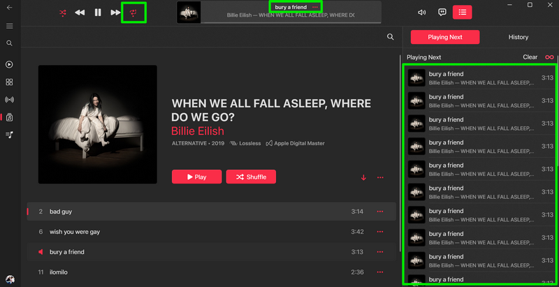 现在,说到工作重复按钮Apple Music 库中的歌曲部分很有趣。无论您的歌曲是否在队列列表中随机播放,如果您激活重复按钮,它本质上什么也没做。