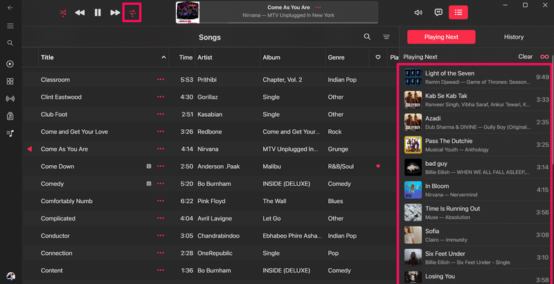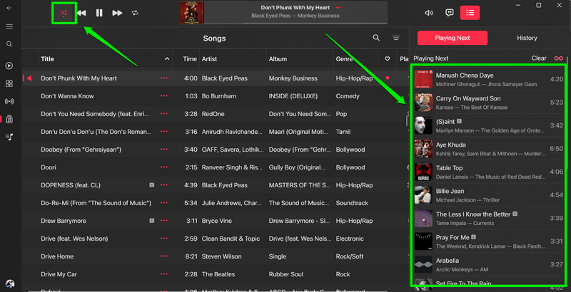 如果你激活随机播放按钮此时,队列列表中的歌曲将被随机化正如他们应该的那样。