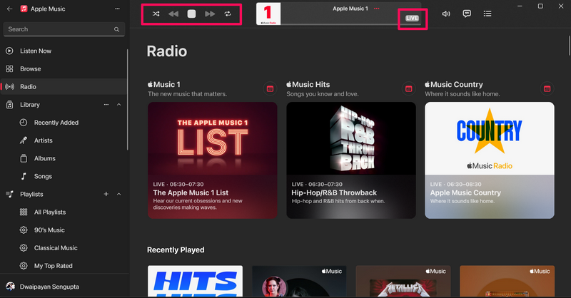 现在,要记住的另一件重要的事情是随机播放和重复按钮,以及“向前跳”和“向后跳”按钮,将在 Windows 11 上的 Apple Music 应用中播放现场广播电台时不起作用。