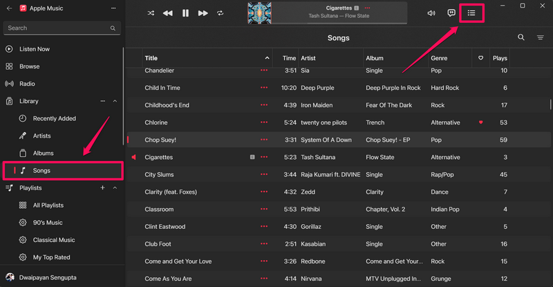 因此,当您播放 Apple Music 资料库中“歌曲”部分中的歌曲时,您可以单击队列按钮(下面的屏幕截图)打开即将播放的歌曲列表。