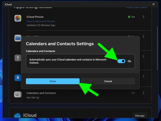 - 现在,确保“自动将您的 iCloud 日历和联系人同步到 Microsoft Outlook”切换处于活动状态,然后点击完毕按钮进行确认。