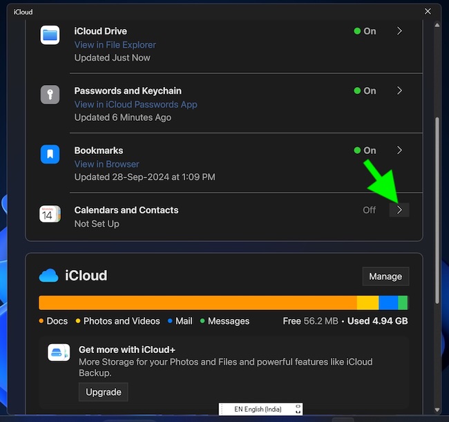 - 在 iCloud 应用程序内,向下滚动直至找到“日历和联系人”部分并单击箭位于最右侧。