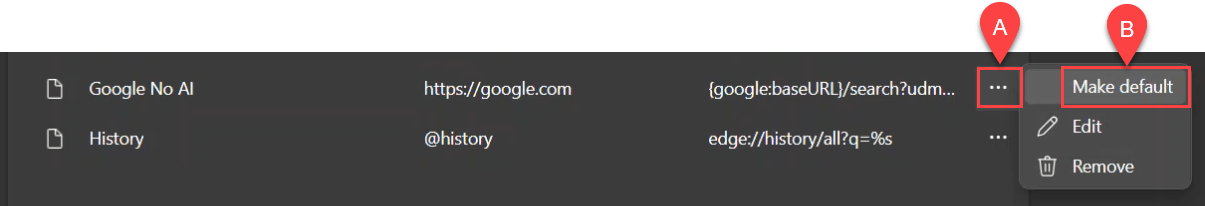 - 选择三点菜单在新的 Google No AI 选项旁边,然后选择设为默认。