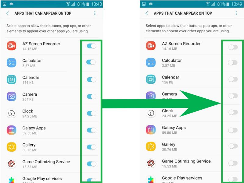 - 手动关闭所有应用程序的屏幕覆盖权限。