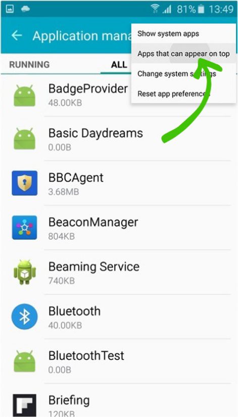 - 现在点击该选项“覆盖其他应用程序”或者 '可以出现在顶部的应用程序'。