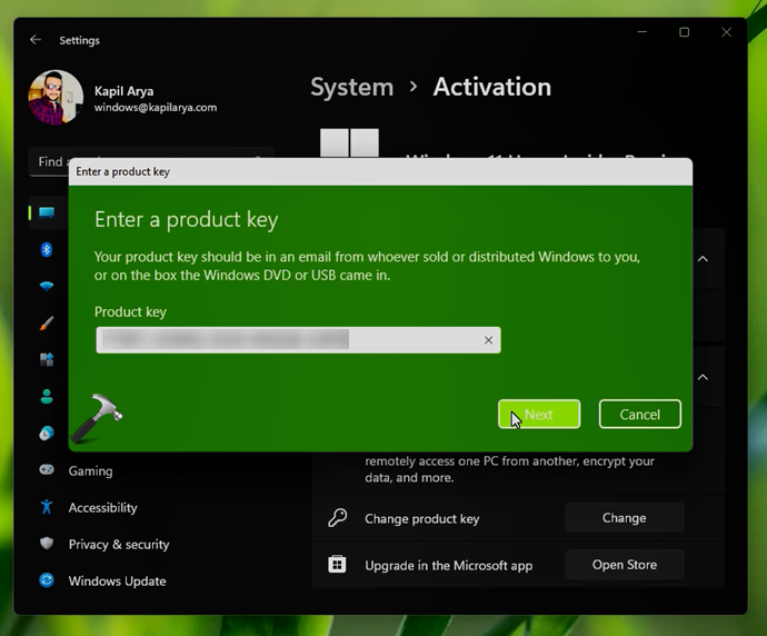 4.之后,将弹出一个输入产品密钥的窗口。输入您的 Windows 11 Pro 正版产品密钥并单击下一个。