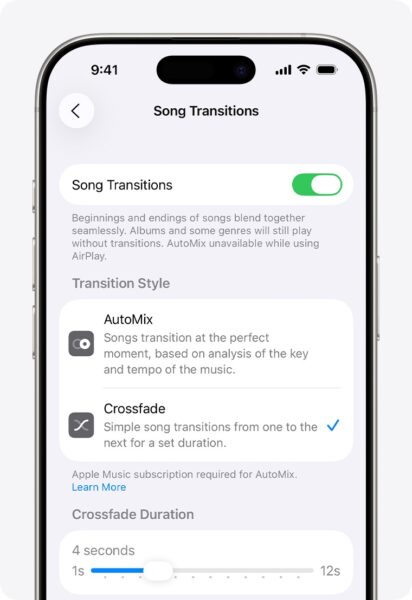 - 即使没有订阅,Crossfade 也适用于 iPhone、iPad、Vision Pro 和 Mac。
