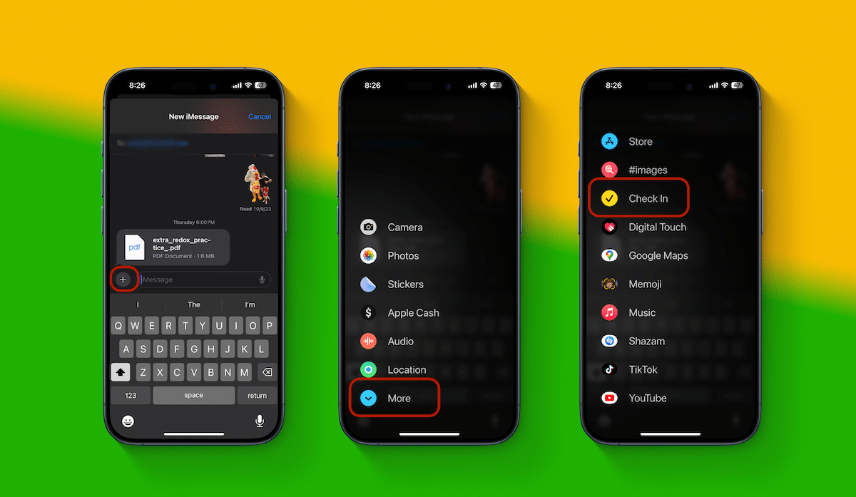 在 iOS 17 中,Apple 在消息应用程序中引入了一项名为“签入”的新安全功能。用户可以自动发送“签到”通知,让家人或朋友知道他们已到达目的地。