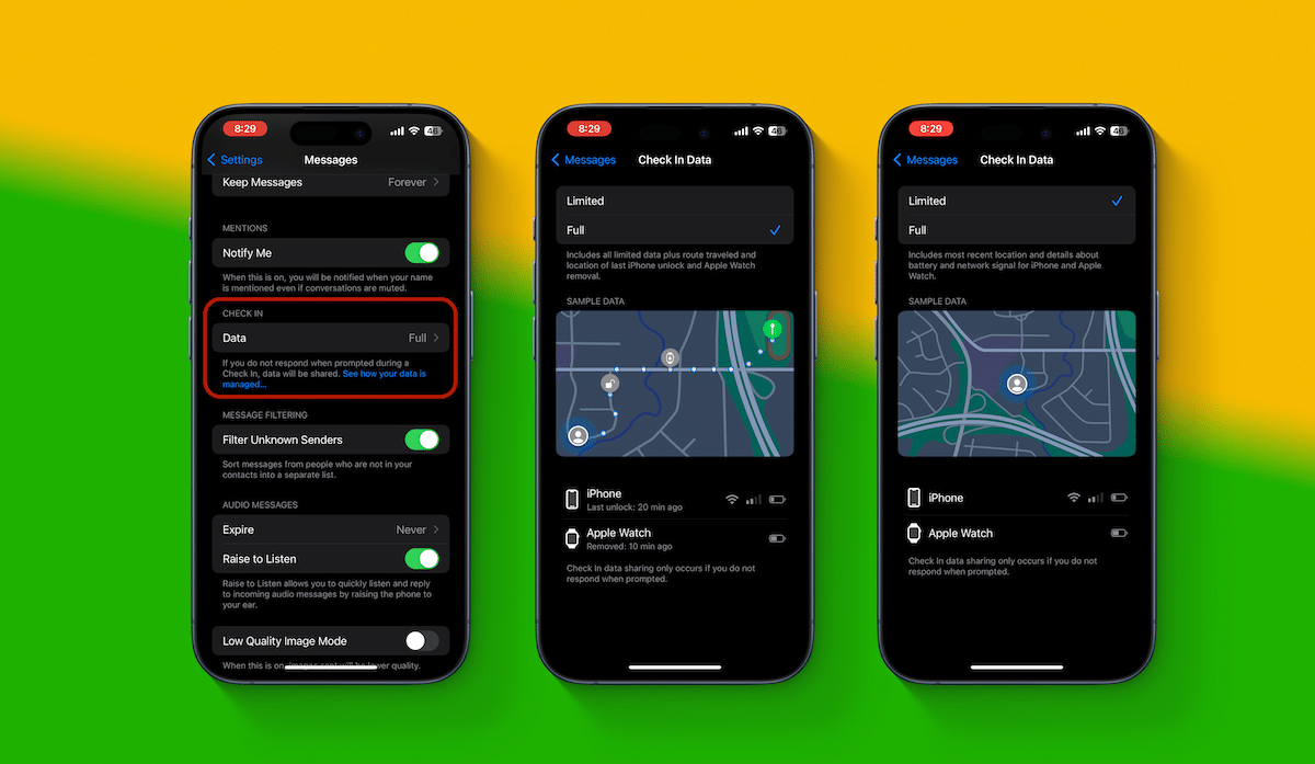 您还可以直接从“消息”应用程序中的“签入”中选择或编辑共享详细信息。