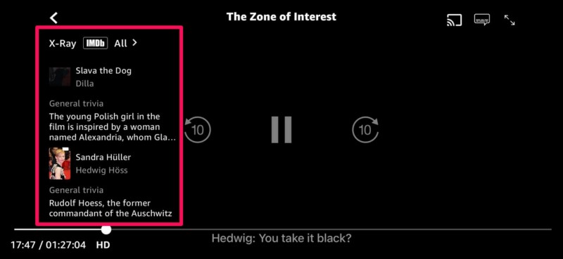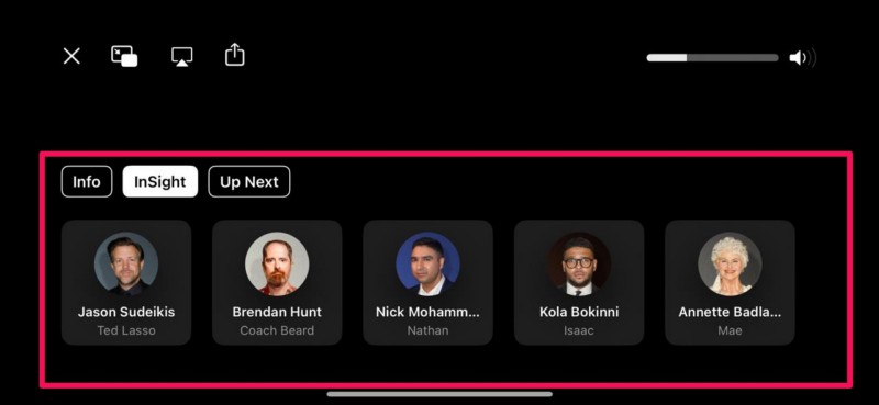 InSight 功能类似于 Prime Video 的 X-Ray 功能,并且工作方式相同。然而,与 Prime Video 应用程序中的 X-Ray 功能不同,该功能不仅显示屏幕上的演员姓名,还提供有关内容的一般琐事和有趣的事实,Apple 的 InSight 只显示男女演员的姓名,仅此而已。